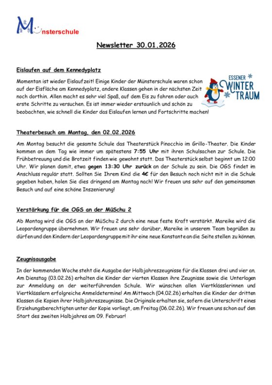 Am 21.11.2025 kam ein ganz besonderer Gast in die Münsterschule – der Essener Oberbürgermeister Thomas Kufen. Zum bundesweiten Vorlesetag las Herr Kufen den Kindern aus den Klassen 1a und 1b aus dem Buch „Ein komischer Vogel“ vor. In der Geschichte geht es darum, dass wir nicht alle gleich, aber jeder besonders und wertvoll ist. Herr Kufen nahm sich im Anschluss noch Zeit und beantwortete die Fragen der Kinder zu seiner Person und seinen Aufgaben als Oberhaupt der Stadt Essen.